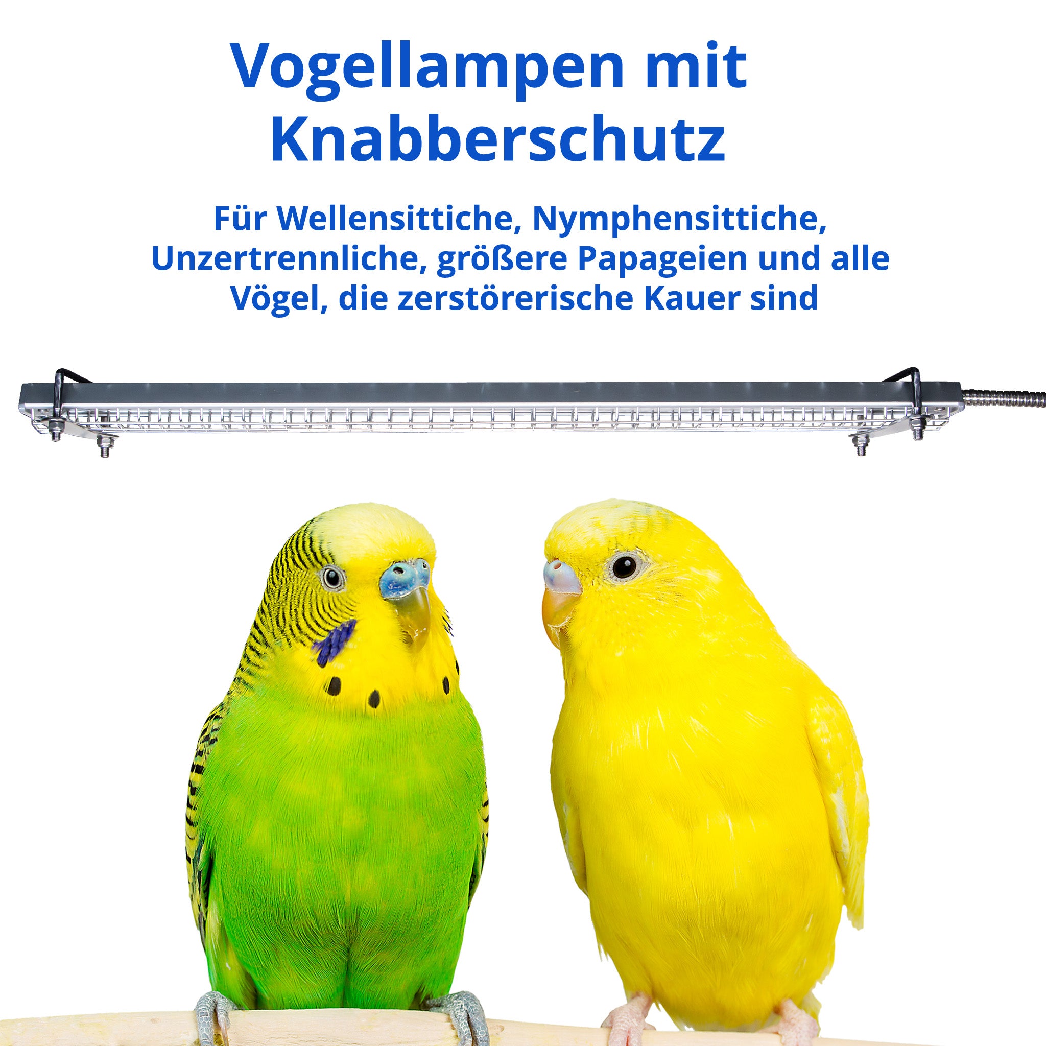 HappyBird Vogellampen mit Knabberschutz richten sich an alle Vogelarten mit knabber-freudigem Hakenschnabel wie Papageien oder Wellensittiche. Zum Schutz der Tiere verfügen diese Vogellampen über ein Edelstahlgitter, eine Kabel-schutzummantelung und eine besonders robuste Anbringung.