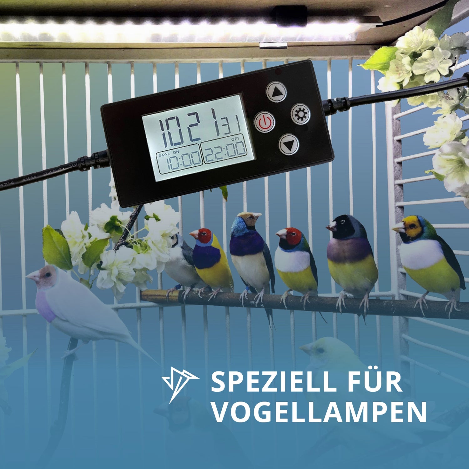 Besonders effektiv ist die Nutzung einer HappyBird Vogellampe in Kombination mit der digitalen Zeitschaltuhr. Diese sorgt für einen geregelten Tag-Nacht-Rhythmus der Vögel und schaltet das Licht über einen Zeitraum von 20 Minuten sanft ein und aus.