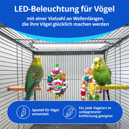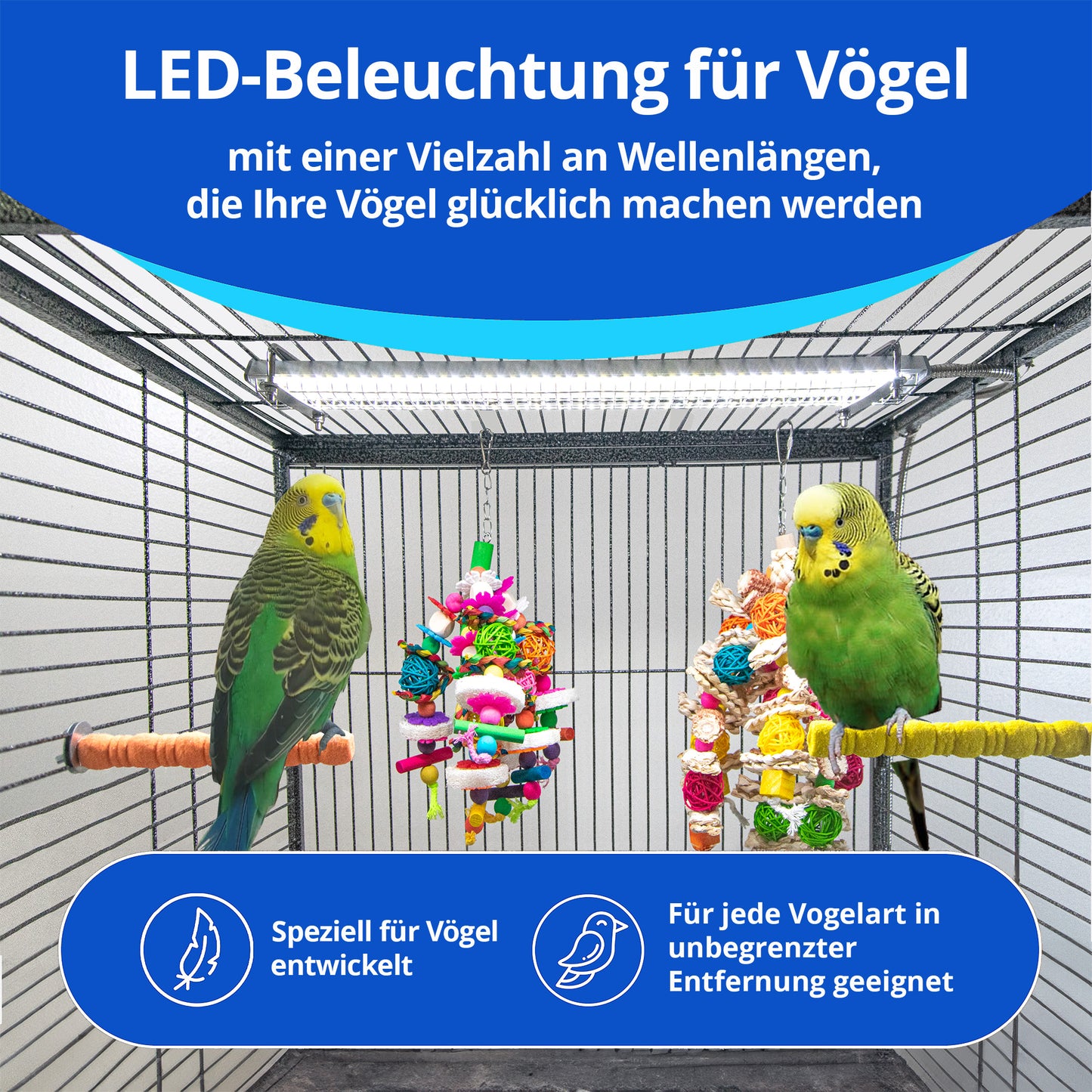Hochwertige LED-Lampe mit einer Vielzahl von Wellenlängen, um Ihren Vogel glücklich und gesund zu halten. Entwickelt für selbst die aggressivsten Knabberer und sicher für alle Vogelarten. Einfach auf oder in den meisten Vogelkäfigen zu installieren. Erhältlich in 3 verschiedenen Längen für Käfige unterschiedlicher Größen: 60 cm, 45 cm und 25 cm. Der Lichtausgang simuliert eine natürliche Umgebung und verstärkt die Farben Ihres Vogels – angenehm für Mensch und Vogel! Kostengünstig im Betrieb und ohne Glühbirnenwechsel.