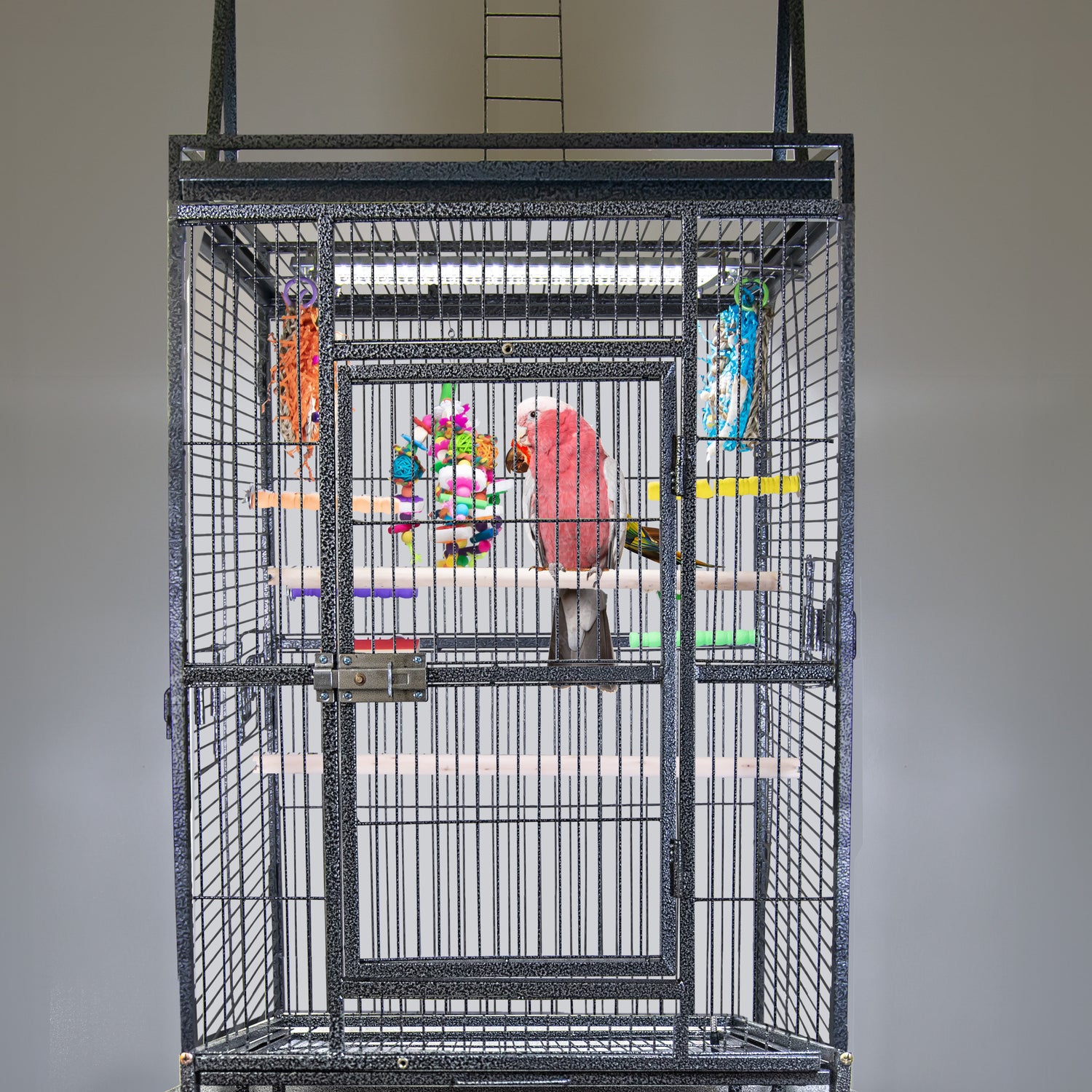 Das Netzkabel MUSS mit den mitgelieferten Edelstahl-Kabelbindern gesichert werden. Stärkere Schnäbel können in das Edelstahlrohr beißen, wenn sie es vollständig erreichen können. Auch herabhängende Kabel können gefährlich für Ihre Vögel sein, daher sollten Sie diese sicher am Käfig befestigen.